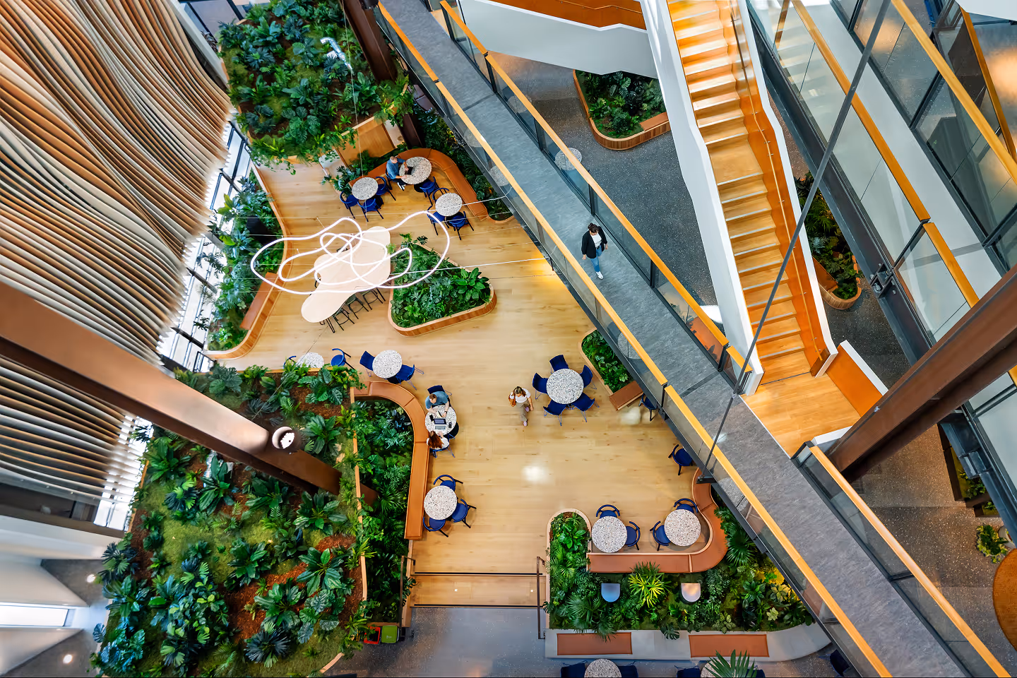 Designed to support wellbeing at scale, the planting delivers a sense of lushness and continuity while meeting the technical demands of a large atrium environment. Lightweight planter systems and a custom forest-floor substrate reduce structural load, improve acoustics and enable safe long-term maintenance. Closely integrated with the architecture, the planting responds to natural light, materiality and movement throughout the day, creating a restorative interior landscape that supports focus, collaboration and everyday use.