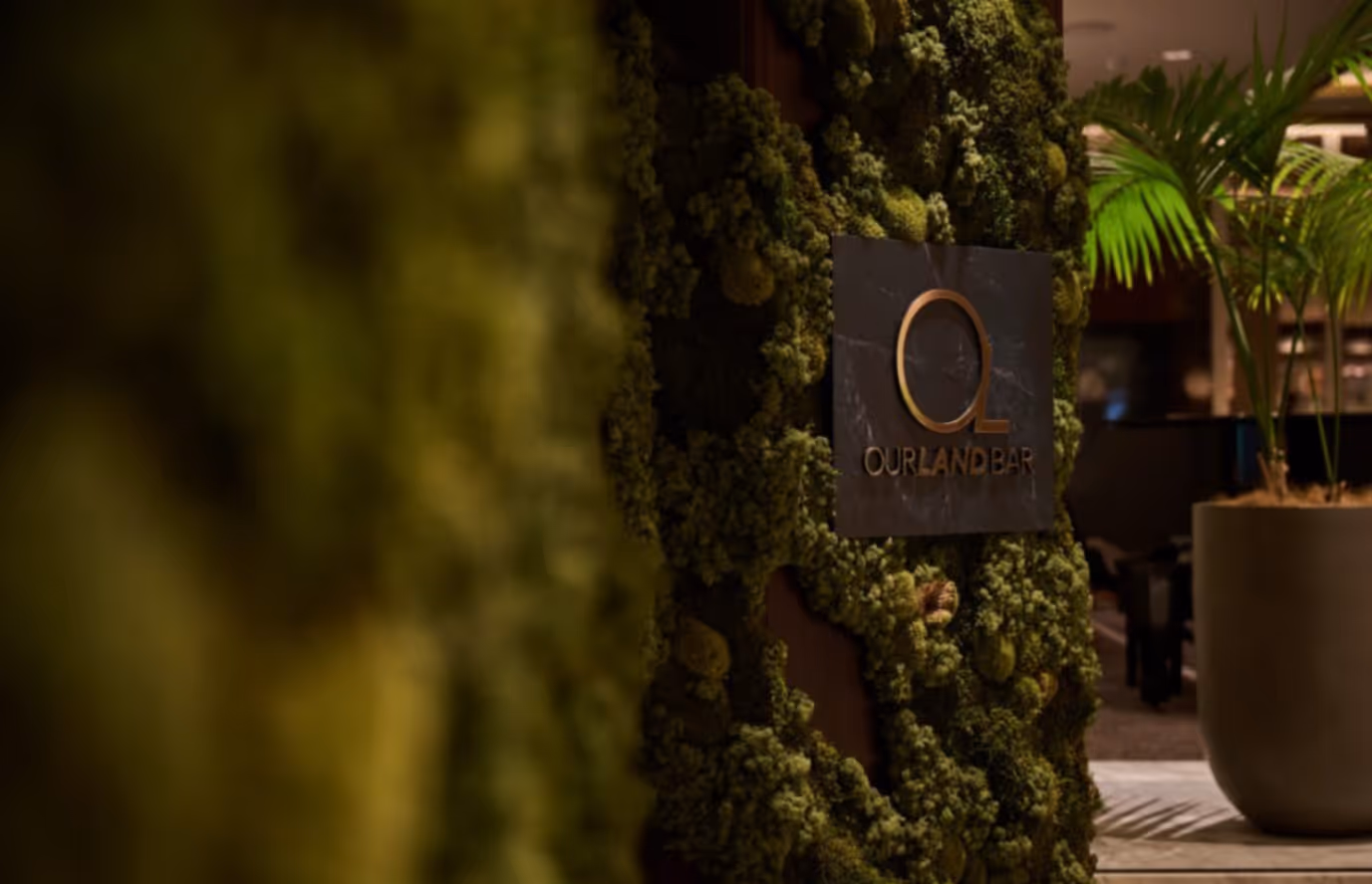An award-winning sculptural moss installation transforming the entrance to Our Land Bar at Cordis Hotel.